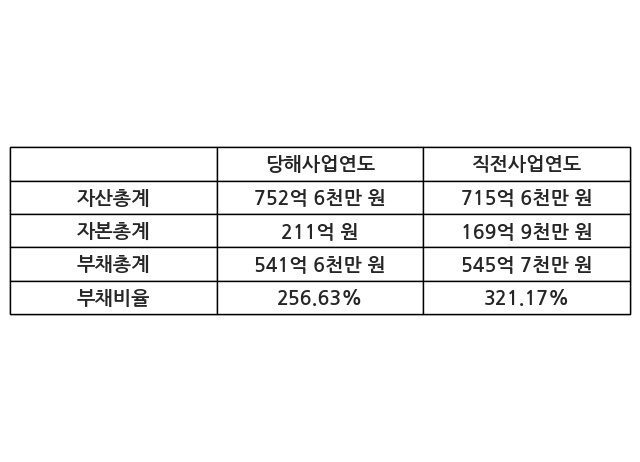 또한, 이번사업연도의 자산총계는 752억 6천만 원으로 직전사업연도 대비 5.17% 증가한 한편, 부채총계는 541억 6천만 원으로 -0.75% 감소, 자본총계는 211억 원으로 24.21% 증가했다.