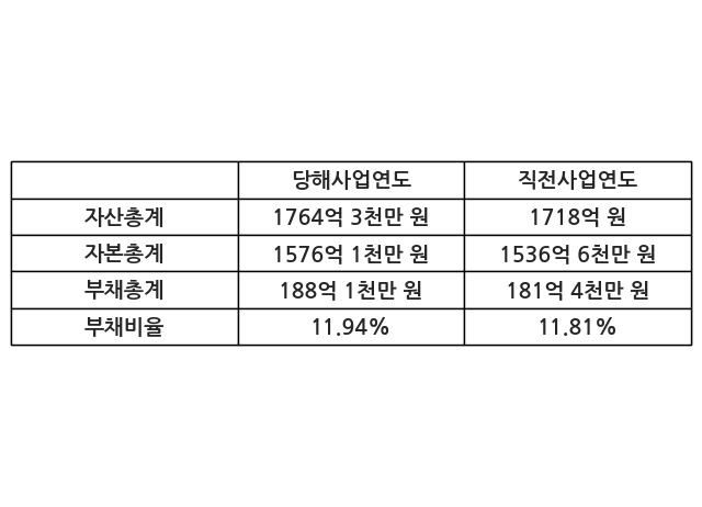 또한, 이번사업연도의 자산총계는 1764억 3천만 원으로 직전사업연도 대비 2.69% 증가한 한편, 부채총계는 188억 1천만 원으로 3.68% 증가, 자본총계는 1576억 1천만 원으로 2.58% 증가했다.