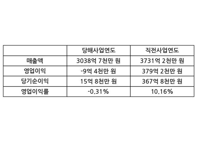 이번사업연도의 매출액은 직전사업연도 대비 -18.56% 감소한 3038억 7천만 원, 영업이익은 -9억 4천만 원, 당기순이익은 15억 8천만 원이라고 공시했다.