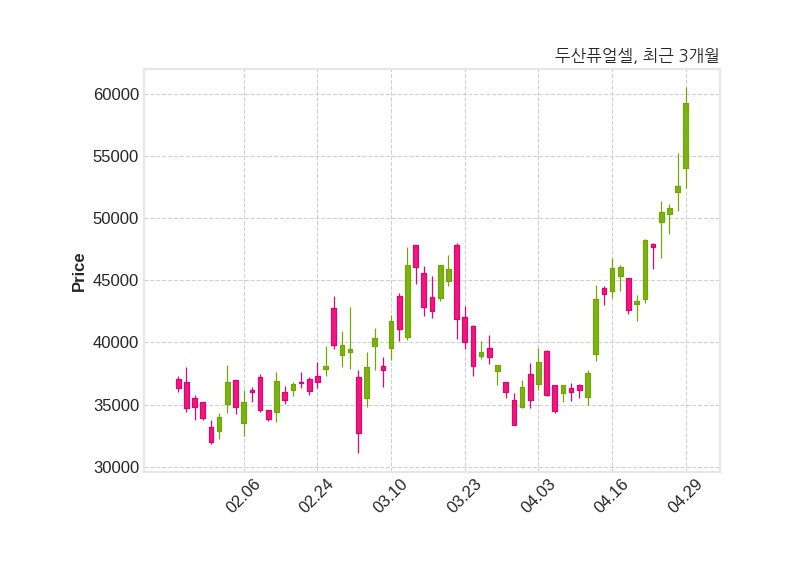 한편, 두산퓨얼셀의 15시 11분 현재주가는 59,200원으로 직전 거래일 대비 6,600원(+12.55%) 상승이며, 거래량은 2,270,310주이다.