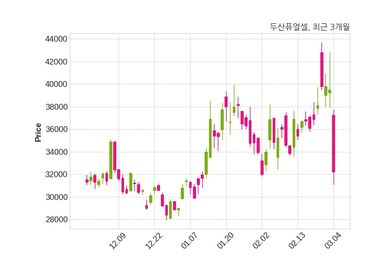 한편, 두산퓨얼셀의 14시 34분 현재주가는 32,200원으로 직전 거래일 대비 7,300원(-18.48%) 하락이며, 거래량은 888,187주이다.