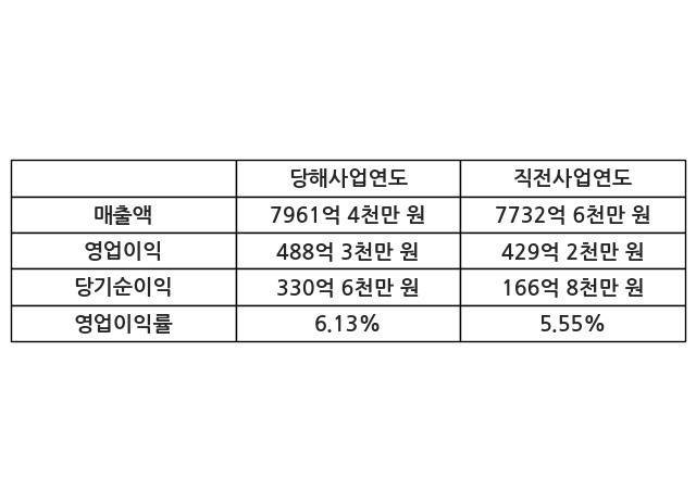 이번사업연도의 매출액은 직전사업연도 대비 2.96% 증가한 7961억 4천만 원, 영업이익은 488억 3천만 원, 당기순이익은 330억 6천만 원이라고 공시했다.