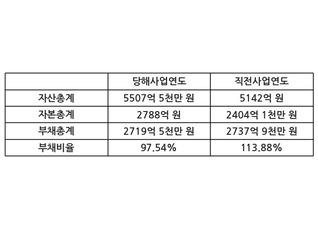 또한, 이번사업연도의 자산총계는 5507억 5천만 원으로 직전사업연도 대비 7.11% 증가한 한편, 부채총계는 2719억 5천만 원으로 -0.67% 감소, 자본총계는 2788억 원으로 15.97% 증가했다.