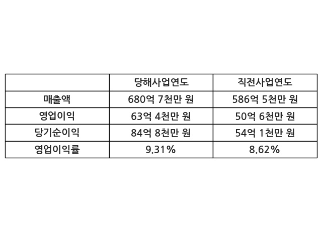 이번사업연도의 매출액은 직전사업연도 대비 16.05% 증가한 680억 7천만 원, 영업이익은 63억 4천만 원, 당기순이익은 84억 8천만 원이라고 공시했다.