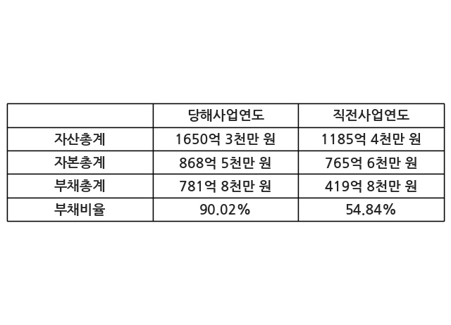 또한, 이번사업연도의 자산총계는 1650억 3천만 원으로 직전사업연도 대비 39.22% 증가한 한편, 부채총계는 781억 8천만 원으로 86.22% 증가, 자본총계는 868억 5천만 원으로 13.44% 증가했다.