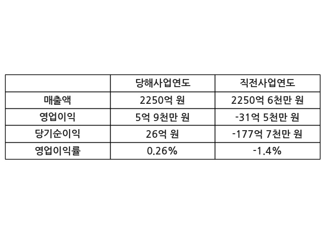 이번사업연도의 매출액은 직전사업연도 대비 -0.03% 감소한 2250억 원, 영업이익은 5억 9천만 원, 당기순이익은 26억 원이라고 공시했다.