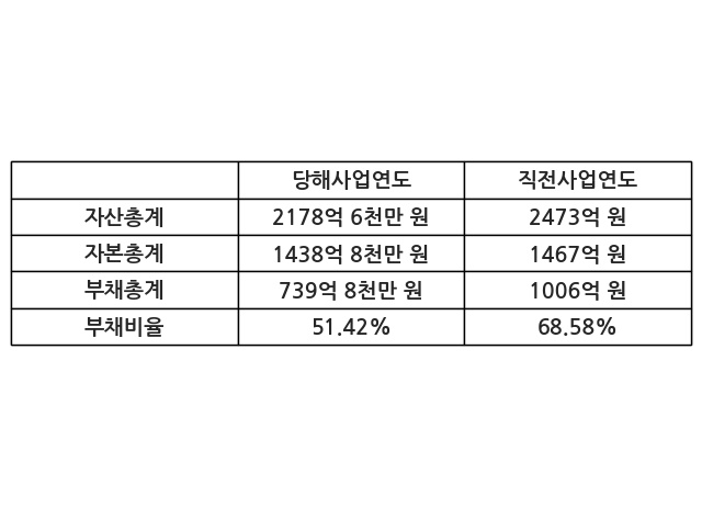 또한, 이번사업연도의 자산총계는 2178억 6천만 원으로 직전사업연도 대비 -11.9% 감소한 한편, 부채총계는 739억 8천만 원으로 -26.46% 감소, 자본총계는 1438억 8천만 원으로 -1.92% 감소했다.