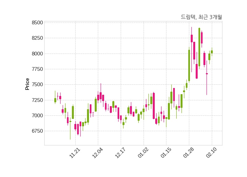 한편, 드림텍의 14시 57분 현재주가는 8,050원으로 직전 거래일 대비 50원(+0.62%) 상승이며, 거래량은 345,086주이다.