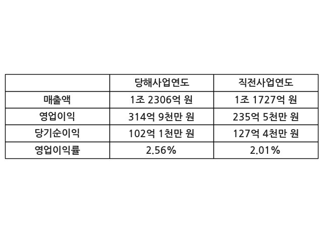 이번사업연도의 매출액은 직전사업연도 대비 4.94% 증가한 1조 2306억 원, 영업이익은 314억 9천만 원, 당기순이익은 102억 1천만 원이라고 공시했다.
