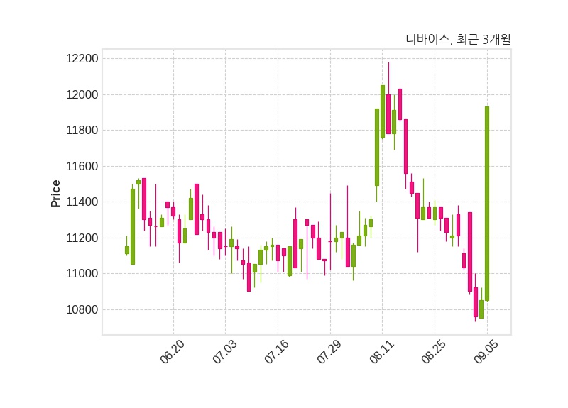 한편, 디바이스의 11시 03분 현재주가는 11,930원으로 직전 거래일 대비 1,080원(+9.95%) 상승이며, 거래량은 3,482주이다.