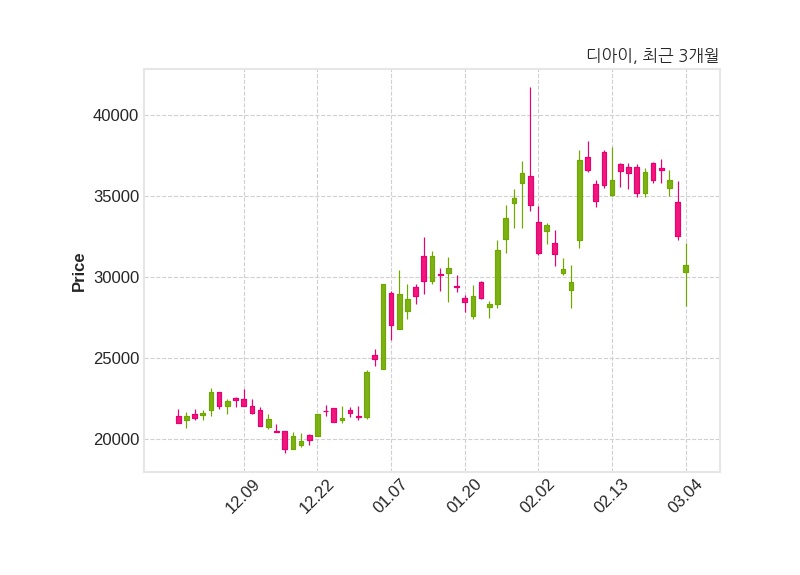 한편, 디아이의 10시 47분 현재주가는 30,700원으로 직전 거래일 대비 1,850원(-5.68%) 하락이며, 거래량은 210,023주이다.