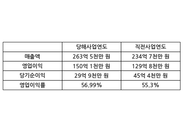 이번사업연도의 매출액은 직전사업연도 대비 12.23% 증가한 263억 5천만 원, 영업이익은 150억 1천만 원, 당기순이익은 29억 9천만 원이라고 공시했다.