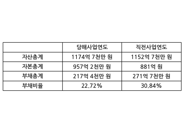 또한, 이번사업연도의 자산총계는 1174억 7천만 원으로 직전사업연도 대비 1.91% 증가한 한편, 부채총계는 217억 4천만 원으로 -19.96% 감소, 자본총계는 957억 2천만 원으로 8.66% 증가했다.