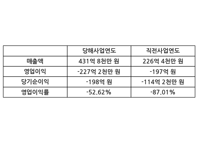 이번사업연도의 매출액은 직전사업연도 대비 90.72% 증가한 431억 8천만 원, 영업이익은 -227억 2천만 원, 당기순이익은 -198억 원이라고 공시했다.
