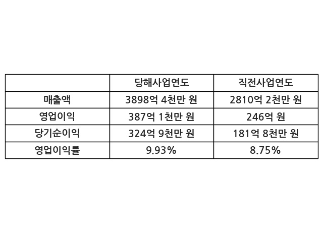 이번사업연도의 매출액은 직전사업연도 대비 38.73% 증가한 3898억 4천만 원, 영업이익은 387억 1천만 원, 당기순이익은 324억 9천만 원이라고 공시했다.