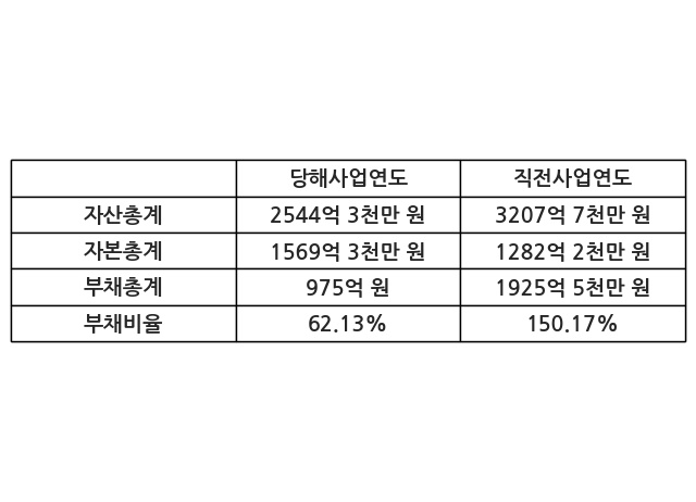 또한, 이번사업연도의 자산총계는 2544억 3천만 원으로 직전사업연도 대비 -20.68% 감소한 한편, 부채총계는 975억 원으로 -49.36% 감소, 자본총계는 1569억 3천만 원으로 22.39% 증가했다.