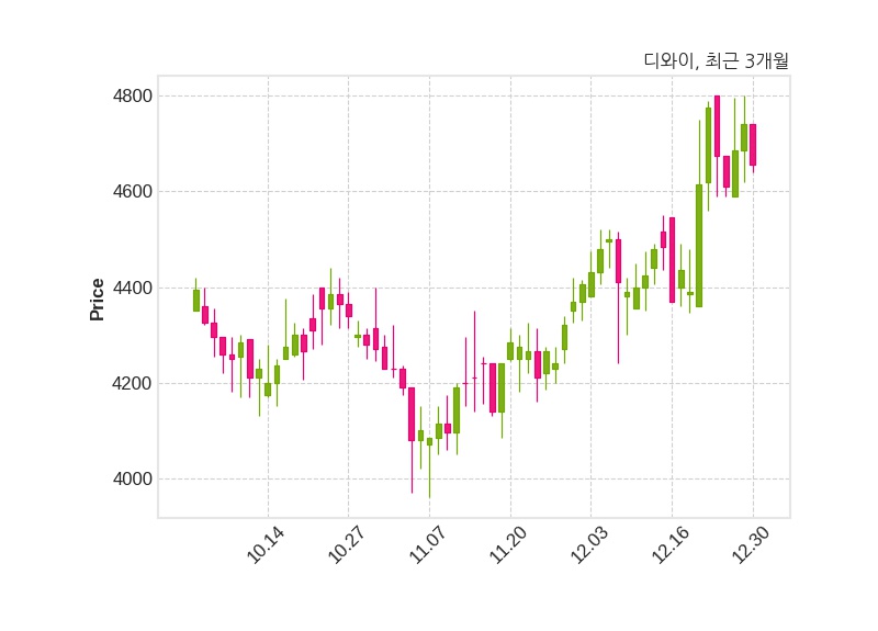 한편, 디와이의 15시 22분 현재주가는 4,655원으로 직전 거래일 대비 85원(-1.79%) 하락이며, 거래량은 40,214주이다.