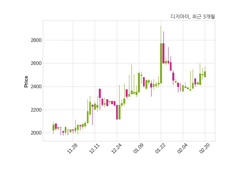 한편, 디지아이는 장 마감 이후 해당 기업공시를 발표했으며 오늘 종가가 2,530원, 거래량은 31,138주로, 직전 거래일 대비 25원(+1.0%) 상승했다.
