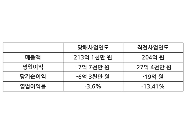이번사업연도의 매출액은 직전사업연도 대비 4.42% 증가한 213억 1천만 원, 영업이익은 -7억 7천만 원, 당기순이익은 -6억 3천만 원이라고 공시했다.