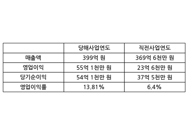 이번사업연도의 매출액은 직전사업연도 대비 7.97% 증가한 399억 원, 영업이익은 55억 1천만 원, 당기순이익은 54억 1천만 원이라고 공시했다.