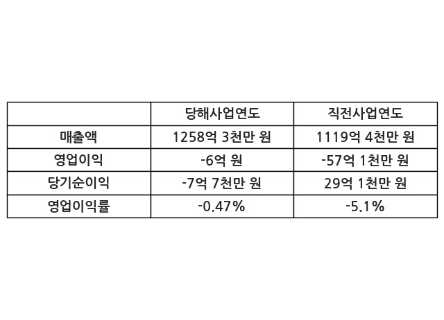 이번사업연도의 매출액은 직전사업연도 대비 12.41% 증가한 1258억 3천만 원, 영업이익은 -6억 원, 당기순이익은 -7억 7천만 원이라고 공시했다.