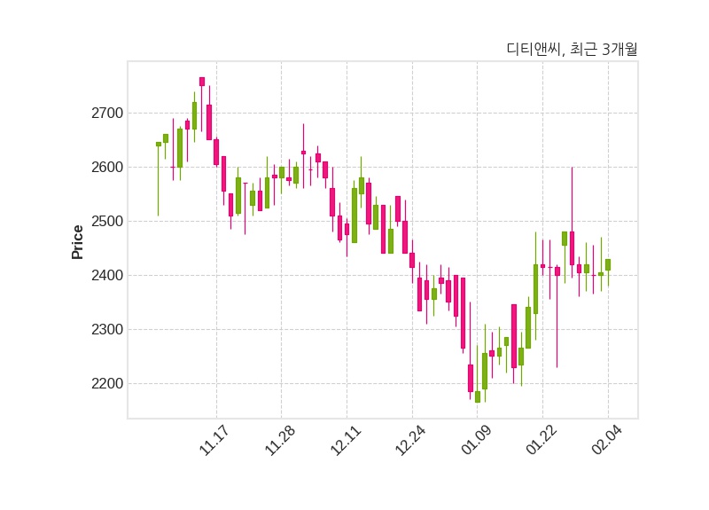 담보설정금액은 300억 원으로한편, 디티앤씨는 장 마감 이후 해당 기업공시를 발표했으며 오늘 종가가 2,430원, 거래량은 32,527주로, 직전 거래일 대비 25원(+1.04%) 상승했다.