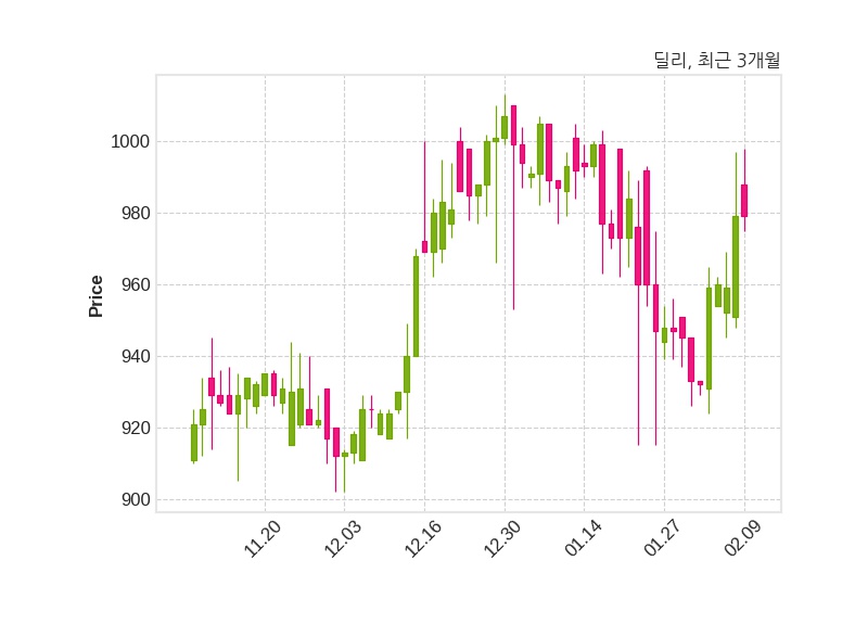 한편, 딜리는 장 마감 이후 해당 기업공시를 발표했으며 오늘 종가가 979원, 거래량은 32,745주로, 직전 거래일 대비 변동이없다.