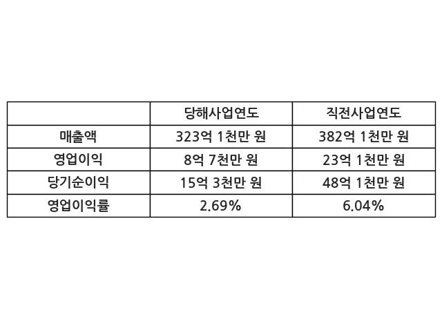 이번사업연도의 매출액은 직전사업연도 대비 -15.46% 감소한 323억 1천만 원, 영업이익은 8억 7천만 원, 당기순이익은 15억 3천만 원이라고 공시했다.