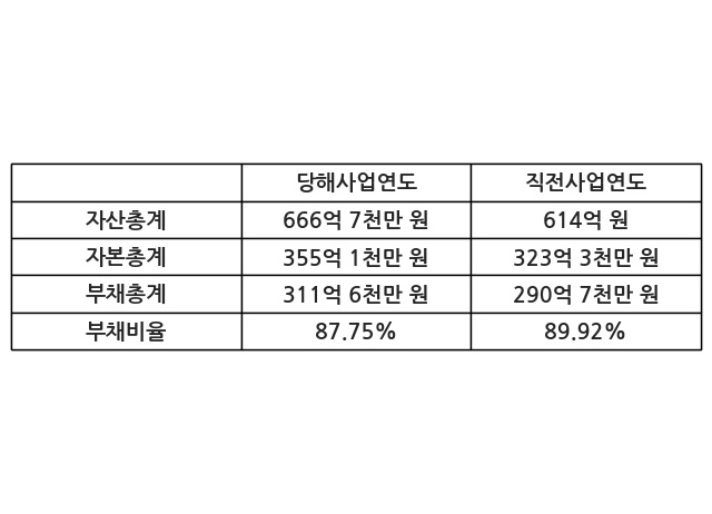 또한, 이번사업연도의 자산총계는 666억 7천만 원으로 직전사업연도 대비 8.57% 증가한 한편, 부채총계는 311억 6천만 원으로 7.18% 증가, 자본총계는 355억 1천만 원으로 9.83% 증가했다.