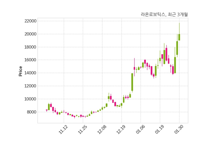 한편, 라온로보틱스의 14시 54분 현재주가는 19,940원으로 직전 거래일 대비 1,080원(+5.73%) 상승이며, 거래량은 2,799,181주이다.