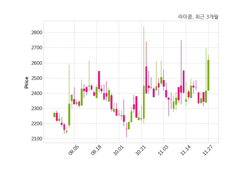 한편, 라이콤의 11시 37분 현재주가는 2,620원으로 직전 거래일 대비 205원(+8.49%) 상승이며, 거래량은 462,359주이다.