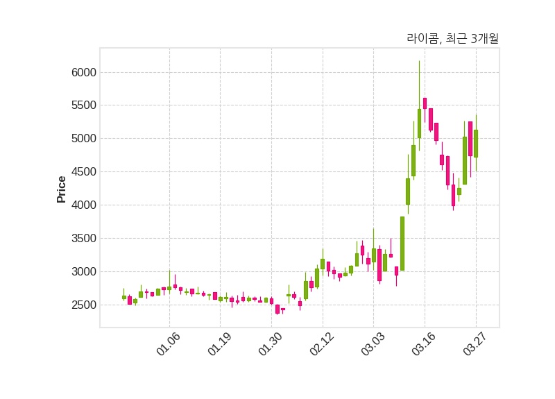 한편, 라이콤은 장 마감 이후 해당 기업공시를 발표했으며 오늘 종가가 5,130원, 거래량은 1,625,681주로, 직전 거래일 대비 390원(+8.23%) 상승했다.