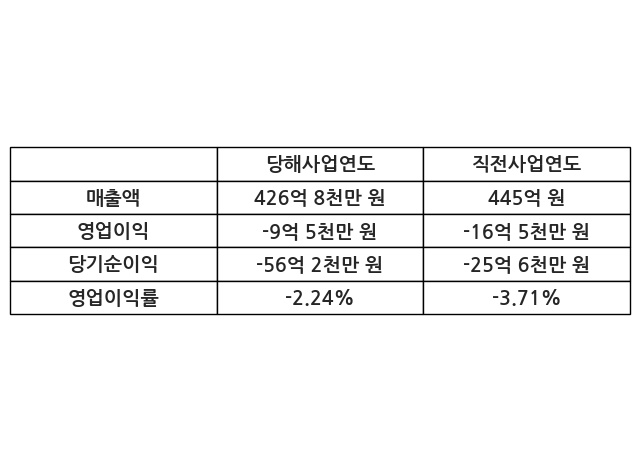 이번사업연도의 매출액은 직전사업연도 대비 -4.09% 감소한 426억 8천만 원, 영업이익은 -9억 5천만 원, 당기순이익은 -56억 2천만 원이라고 공시했다.