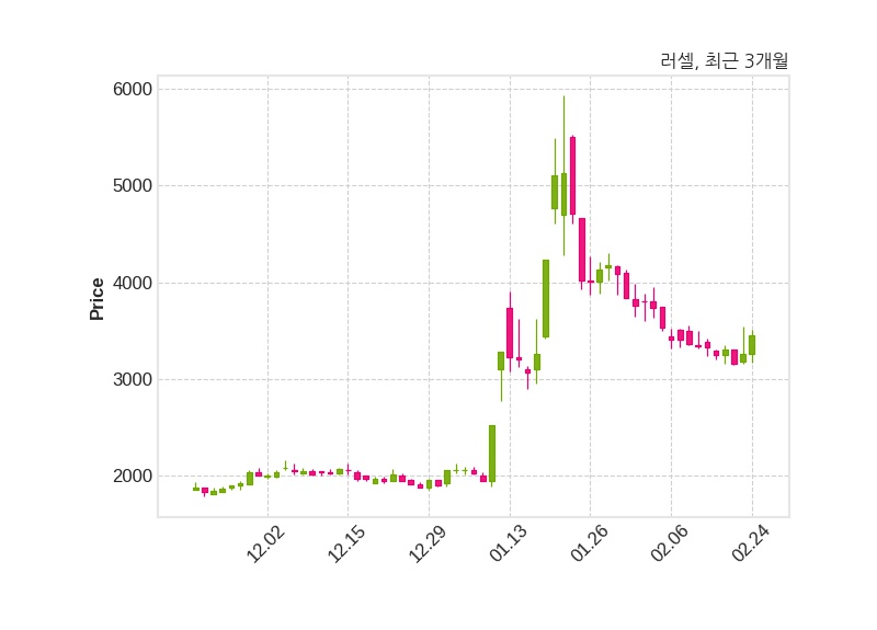 한편, 러셀은 장 마감 이후 해당 기업공시를 발표했으며 오늘 종가가 3,450원, 거래량은 1,229,832주로, 직전 거래일 대비 195원(+5.99%) 상승했다.