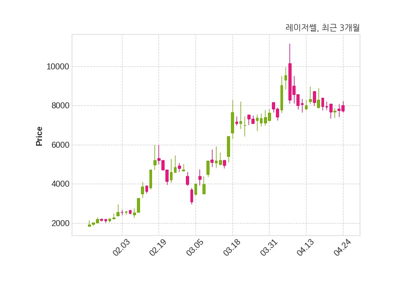 한편, 레이저쎌은 장 마감 이후 해당 기업공시를 발표했으며 오늘 종가가 7,720원, 거래량은 497,536주로, 직전 거래일 대비 40원(-0.52%) 하락했다.