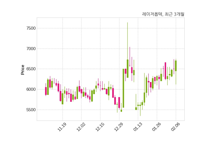 한편, 레이저옵텍은 장 마감 이후 해당 기업공시를 발표했으며 오늘 종가가 6,700원, 거래량은 141,636주로, 직전 거래일 대비 200원(+3.08%) 상승했다.