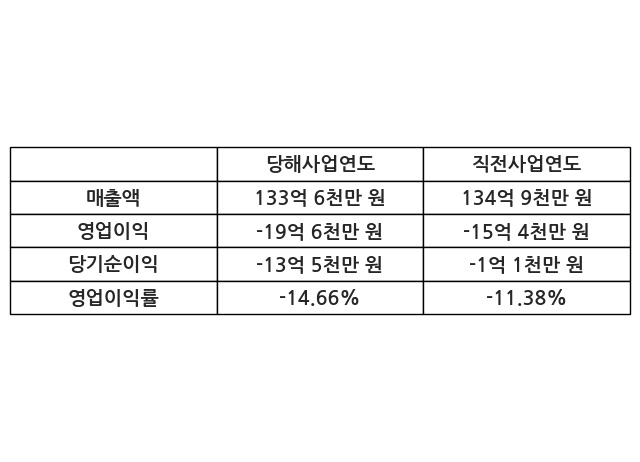 이번사업연도의 매출액은 직전사업연도 대비 -0.98% 감소한 133억 6천만 원, 영업이익은 -19억 6천만 원, 당기순이익은 -13억 5천만 원이라고 공시했다.