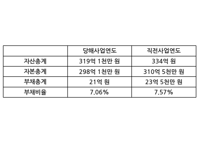 또한, 이번사업연도의 자산총계는 319억 1천만 원으로 직전사업연도 대비 -4.46% 감소한 한편, 부채총계는 21억 원으로 -10.54% 감소, 자본총계는 298억 1천만 원으로 -4.0% 감소했다.