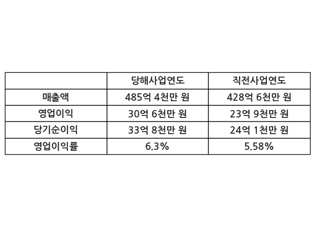 이번사업연도의 매출액은 직전사업연도 대비 13.26% 증가한 485억 4천만 원, 영업이익은 30억 6천만 원, 당기순이익은 33억 8천만 원이라고 공시했다.