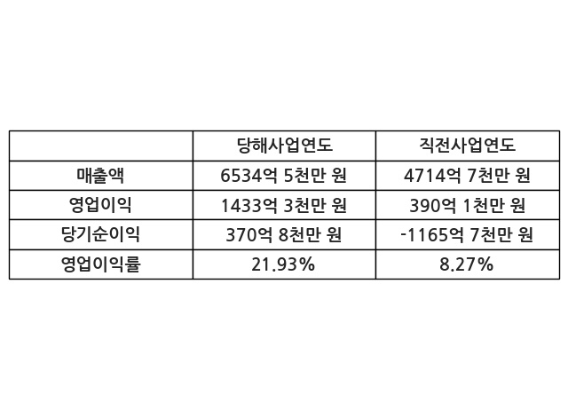 이번사업연도의 매출액은 직전사업연도 대비 38.6% 증가한 6534억 5천만 원, 영업이익은 1433억 3천만 원, 당기순이익은 370억 8천만 원이라고 공시했다.