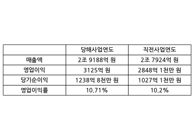 이번사업연도의 매출액은 직전사업연도 대비 4.53% 증가한 2조 9188억 원, 영업이익은 3125억 원, 당기순이익은 1238억 8천만 원이라고 공시했다.