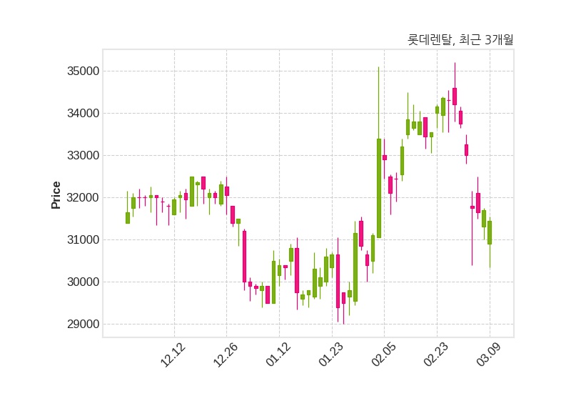 한편, 롯데렌탈은 장 마감 이후 해당 기업공시를 발표했으며 오늘 종가가 31,450원, 거래량은 41,442주로, 직전 거래일 대비 250원(-0.79%) 하락했다.