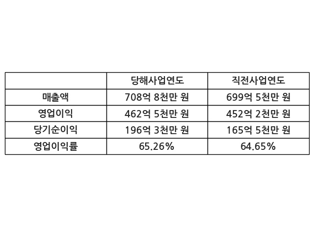 이번사업연도의 매출액은 직전사업연도 대비 1.32% 증가한 708억 8천만 원, 영업이익은 462억 5천만 원, 당기순이익은 196억 3천만 원이라고 공시했다.