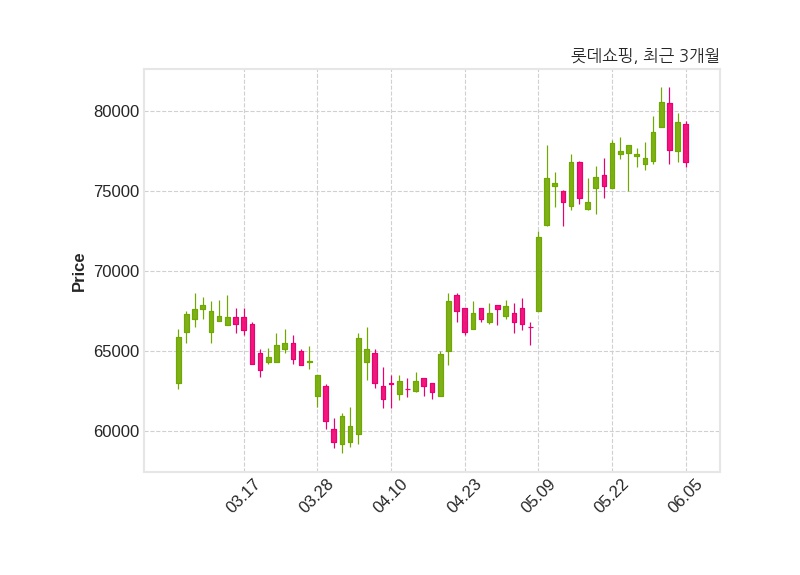 한편, 롯데쇼핑의 13시 52분 현재주가는 76,800원으로 직전 거래일 대비 2,500원(-3.15%) 하락이며, 거래량은 69,266주이다.