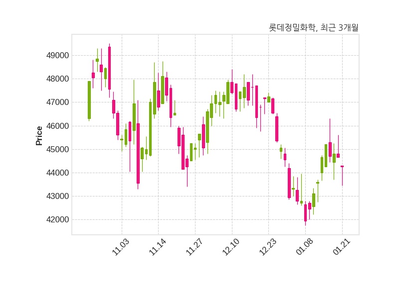 한편, 롯데정밀화학은 장 마감 이후 해당 기업공시를 발표했으며 오늘 종가가 44,250원, 거래량은 47,378주로, 직전 거래일 대비 400원(-0.9%) 하락했다.