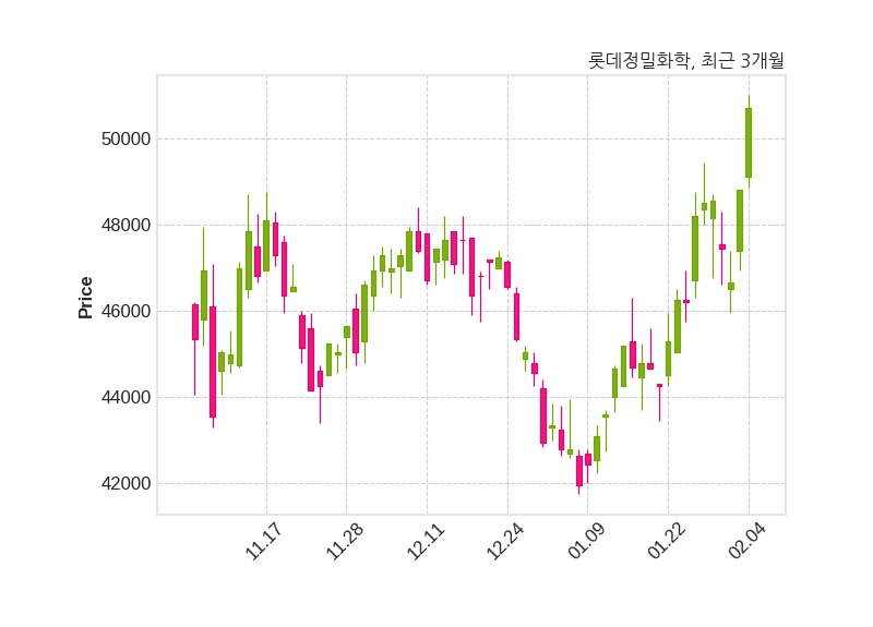 한편, 롯데정밀화학의 14시 20분 현재주가는 50,700원으로 직전 거래일 대비 1,900원(+3.89%) 상승이며, 거래량은 108,422주이다.