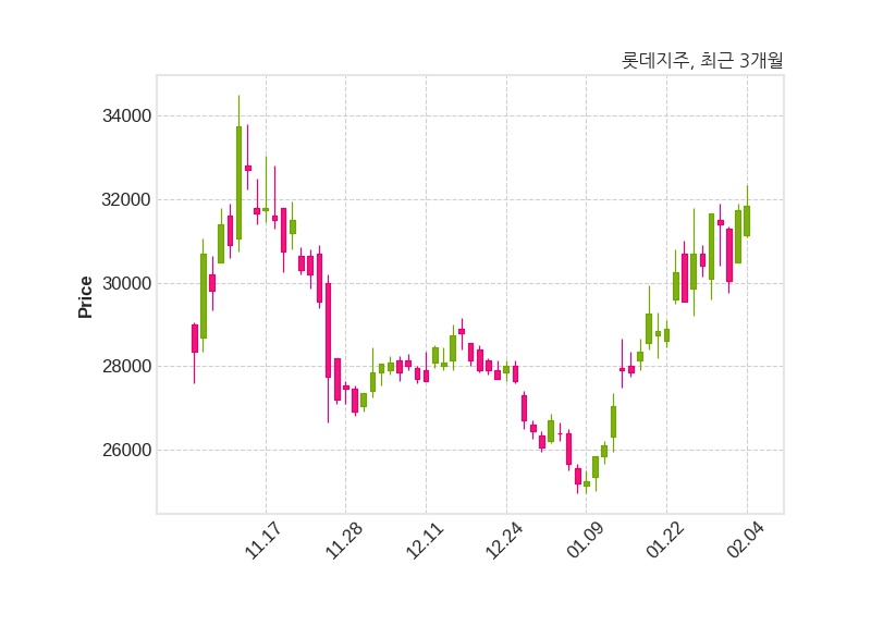 한편, 롯데지주의 15시 06분 현재주가는 31,850원으로 직전 거래일 대비 100원(+0.31%) 상승이며, 거래량은 361,020주이다.
