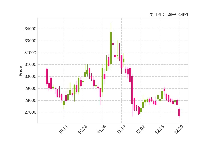 한편, 롯데지주는 장 마감 이후 해당 기업공시를 발표했으며 오늘 종가가 26,700원, 거래량은 275,796주로, 직전 거래일 대비 950원(-3.44%) 하락했다.