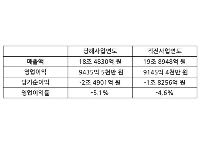 이번사업연도의 매출액은 직전사업연도 대비 -7.1% 감소한 18조 4830억 원, 영업이익은 -9435억 5천만 원, 당기순이익은 -2조 4901억 원이라고 공시했다.
