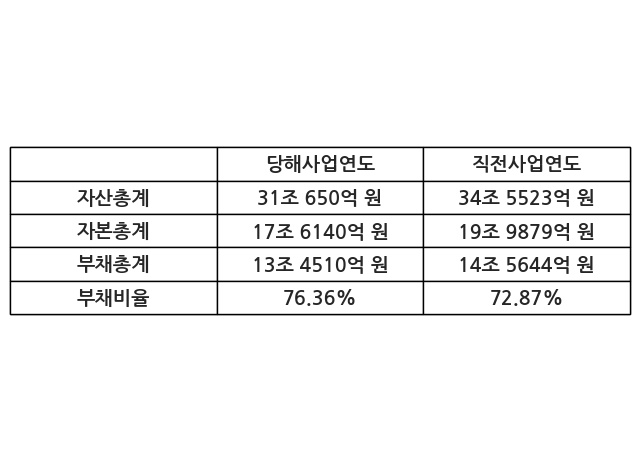 또한, 이번사업연도의 자산총계는 31조 650억 원으로 직전사업연도 대비 -10.09% 감소한 한편, 부채총계는 13조 4510억 원으로 -7.64% 감소, 자본총계는 17조 6140억 원으로 -11.88% 감소했다.